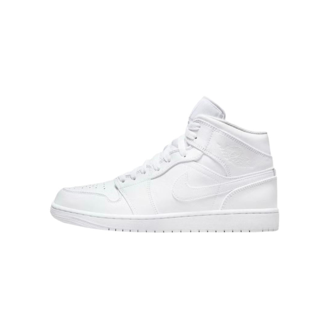 The Air Jordan 1 Mid 'Triple White' offers a clean, minimalist aesthetic with its all-white leather upper. This mid-top sneaker delivers a balanced combination of style and support, featuring a durable sole for reliable traction. Its timeless design and premium materials make it a versatile choice for both casual wear and collectors seeking a refined, classic look.