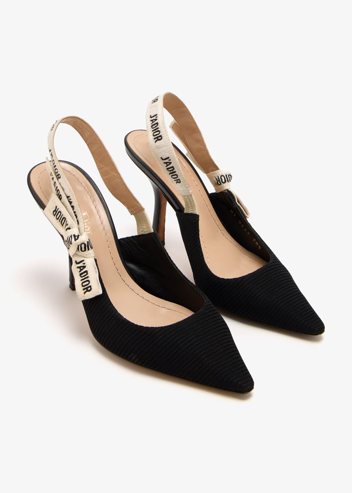 This is a Dior J'Adior slingback pump in black technical fabric with a two-tone embroidered "J'Adior" ribbon and a comma heel.