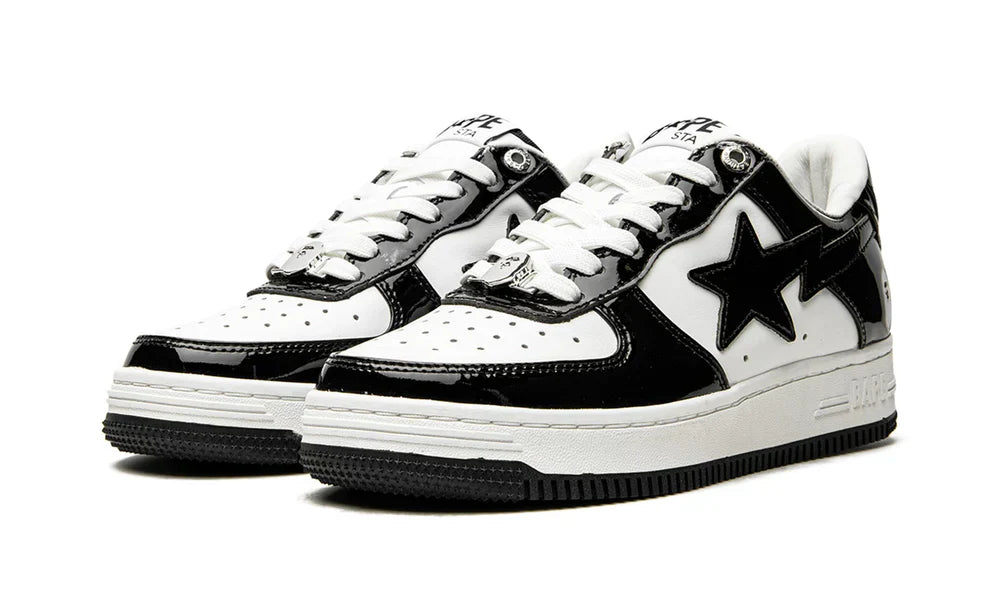 • The BAPE Bape Sta Low “Black/White Patent Leather” is the women’s sizing of the timeless, two-tone, black-and-white colorway of the Japanese streetwear brand’s lifestyle shoe. The BAPE STA’s design is based on throwback basketball shoes from the 1980s, and is one of the brand’s most coveted products. The “Black/White” features a white leather base with contrasting patent leather overlays in black. BAPE’s “STA” logo appears in black patent leather on either side of the shoe. A BAPE logo is embroidered on the lateral side of the heel. Classic “BAPE STA” detailing is printed on the heel and on the tongue tag. A BAPE lace accessory is found on the vamp. The shoe rides on a white rubber midsole and black outsole.