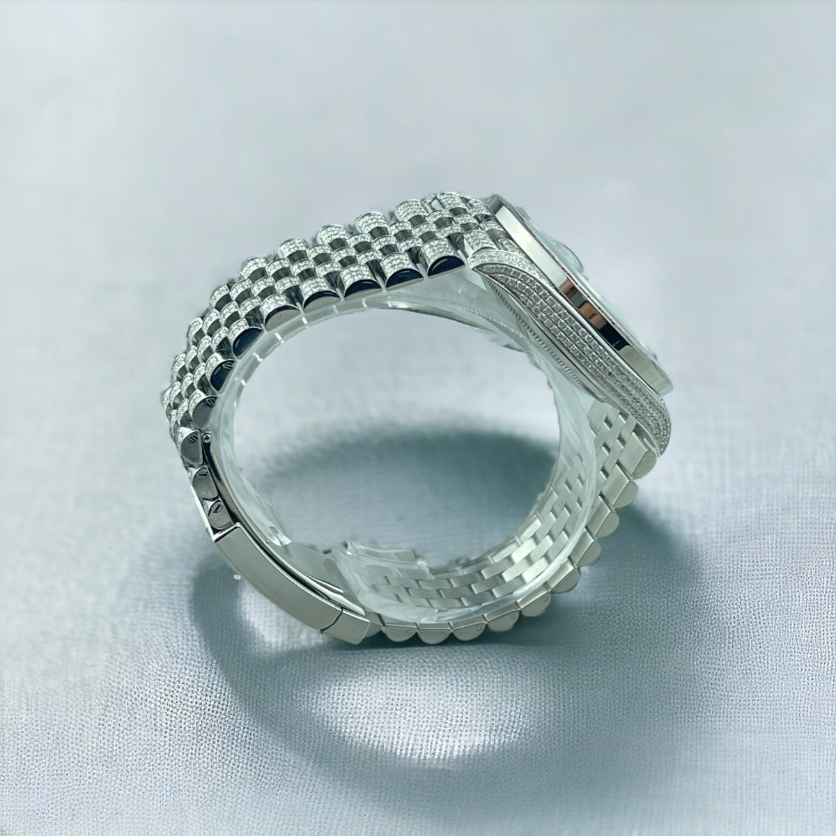 The Rolex Datejust 41 Full Iced Out features a striking ruby bezel paired with a vibrant red Roman numeral dial, creating a bold and luxurious statement. Fully encrusted with diamonds, this timepiece exemplifies exceptional craftsmanship and opulence. Designed for those who appreciate both precision and standout style, it offers a perfect blend of classic Rolex reliability and eye-catching elegance.